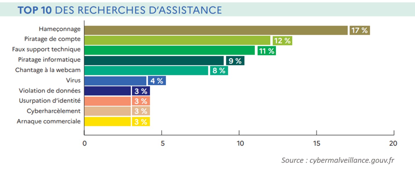 Le rapport de la plateforme gouvernementale recense les principales menaces pour lesquelles les victimes ont recherché de l’assistance. On constate ainsi que depuis 2020, les particuliers sont principalement victimes d’hameçonnage (phishing pour les Anglo-saxons), de piratage de compte, puis de fraudes au faux support technique.