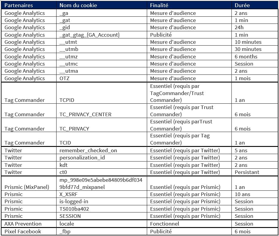 Les cookies utilisés par AXA Prevention peuvent avoir différentes finalités (objectifs) en fonction des sites tiers les délivrant.