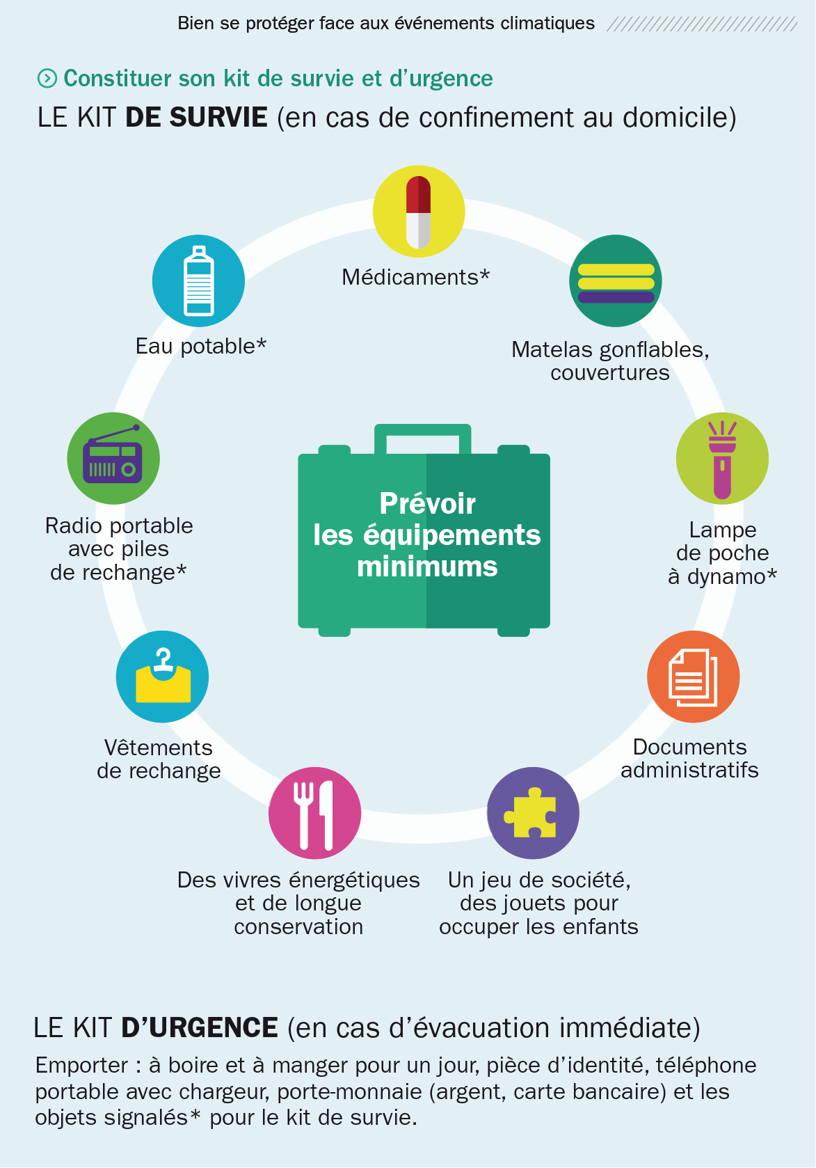 - gardez un kit d’urgence près de vous (avec de l’eau potable, des vivres, vos médicaments, un porte-monnaie, une lampe à dynamo et une radio portable).