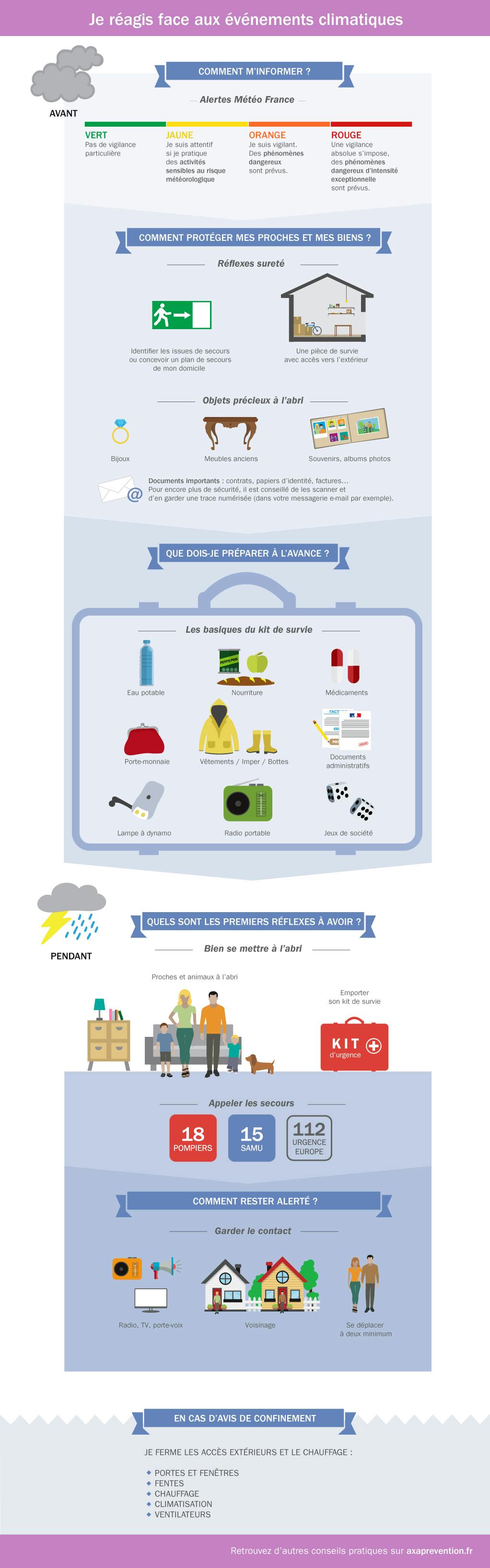 Si vous vous retrouvez pris dans un phénomène climatique exceptionnel cherchez d’abord à vous mettre à l’abri, ainsi que vos proches. Essayez de garder votre sang-froid en toute situation pour agir avec discernement.