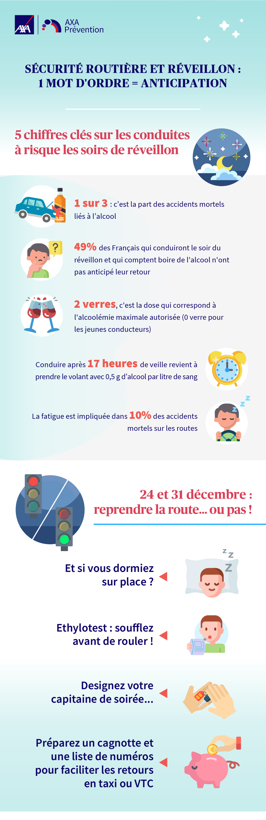 Entre la consommation d’alcool et la fatigue souvent importantes les soirs de fêtes, il est primordial de s’organiser afin de garantir sa sécurité comme celle des autres sur la route. Dormir sur place, limiter sa consommation d’alcool ou encore désigner un capitaine de soirée sont quelques-unes des nombreuses solutions faciles à mettre en place. N’hésitez pas à en discuter avec vos proches pour trouver, ensemble, le fonctionnement qui conviendra à tous les convives. Explications et conseils en images…