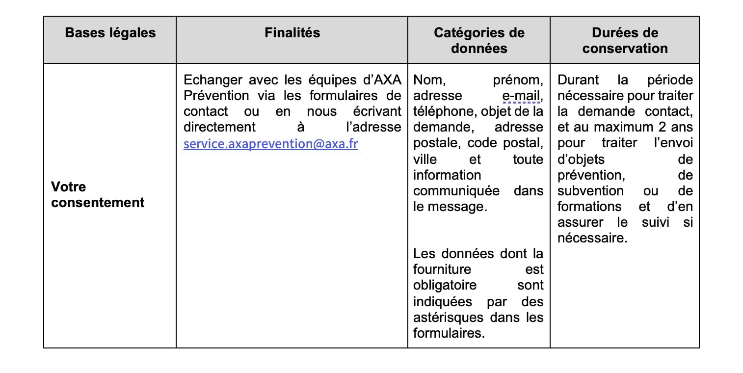 AXA Prévention utilise vos Données personnelles dans le cadre de finalités se fondant sur les bases légales et respectant les durées de conservation suivantes :